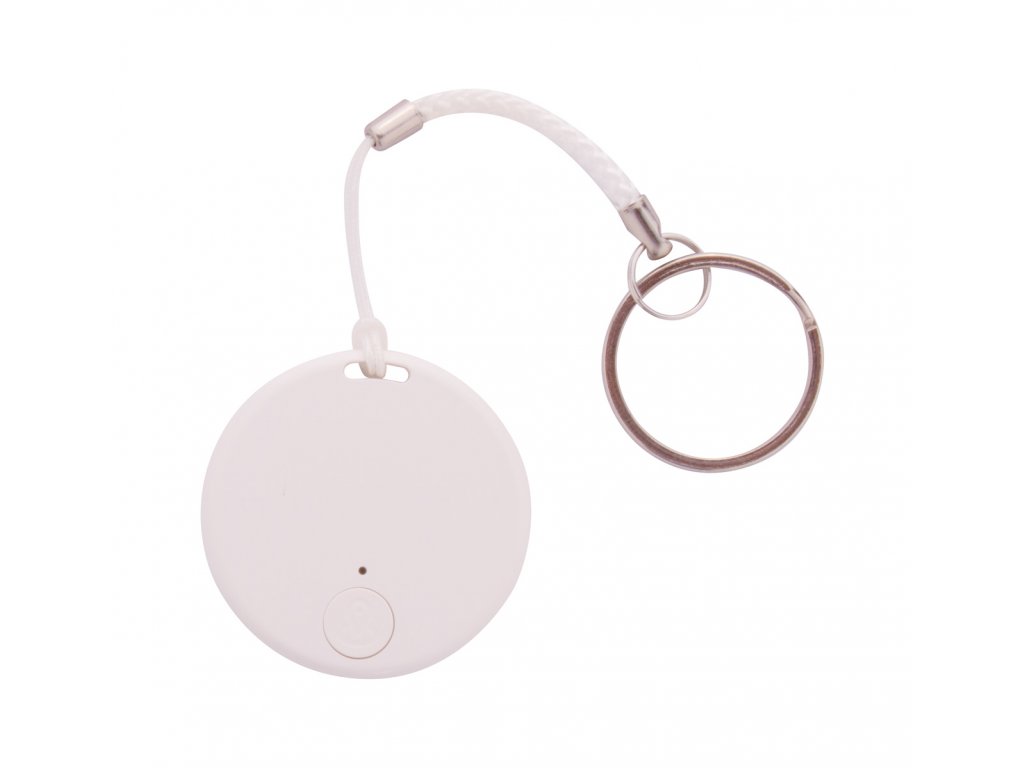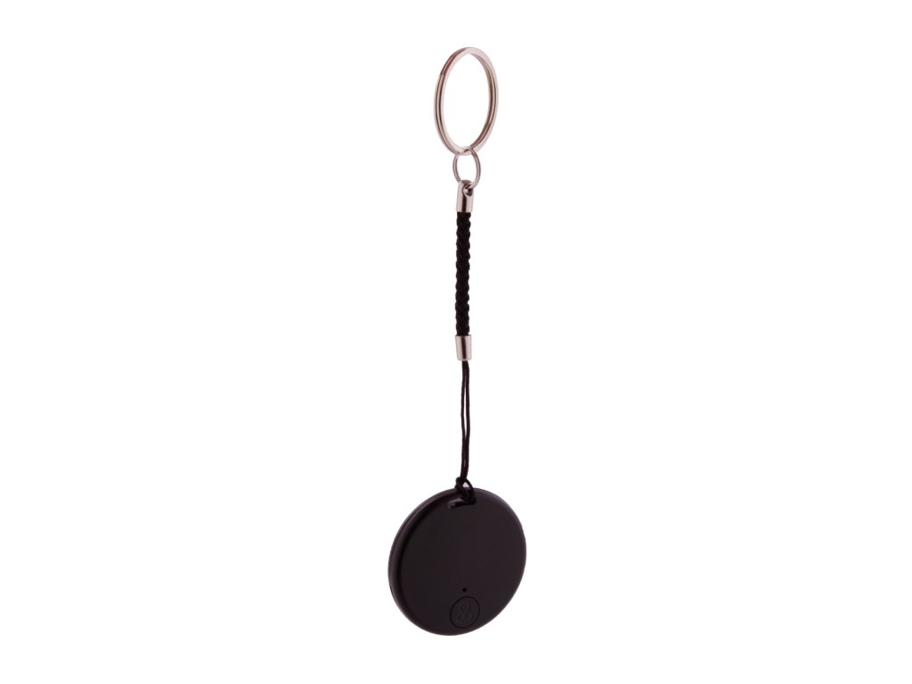 Plastové vyhledávací bluetooth zařízení s textilní šňůrkou a přívěskem na klíče.