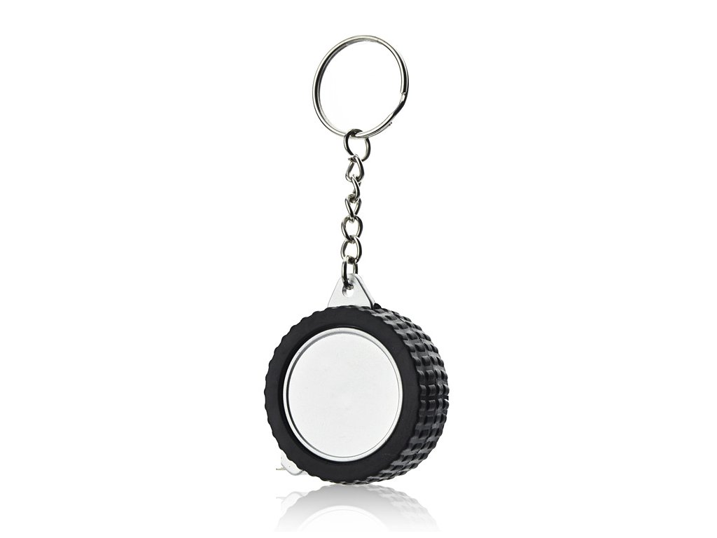 Plastový přívěšek na klíče ve tvaru pneumatiky s metrem o délce 1 m.