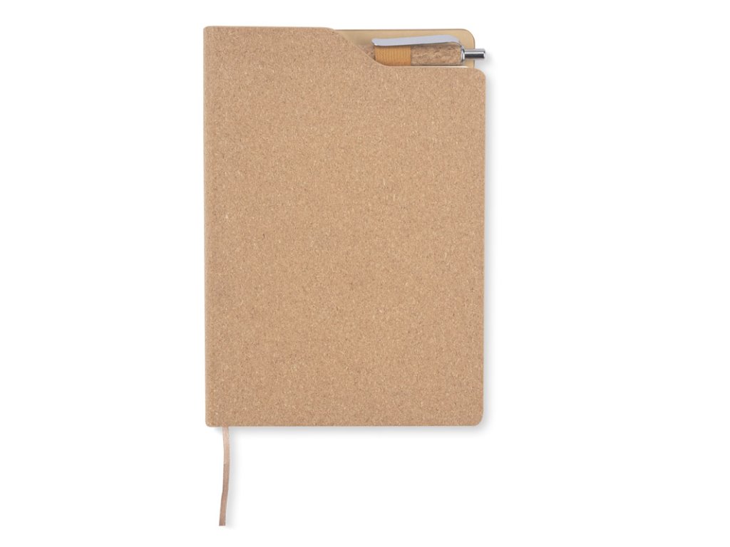 Zápisník má korkové desky + kuličkové pero s modrou náplní