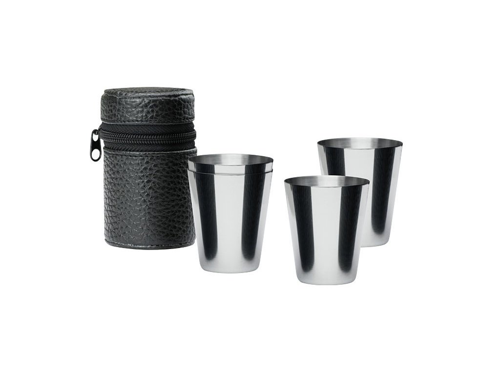 Cestovní pohárky ve stříbrné barvě v černém obalu z umělé kůže s uzavíráním na zip, 4 ks- á/30 ml. V bílé papírové krabičce.