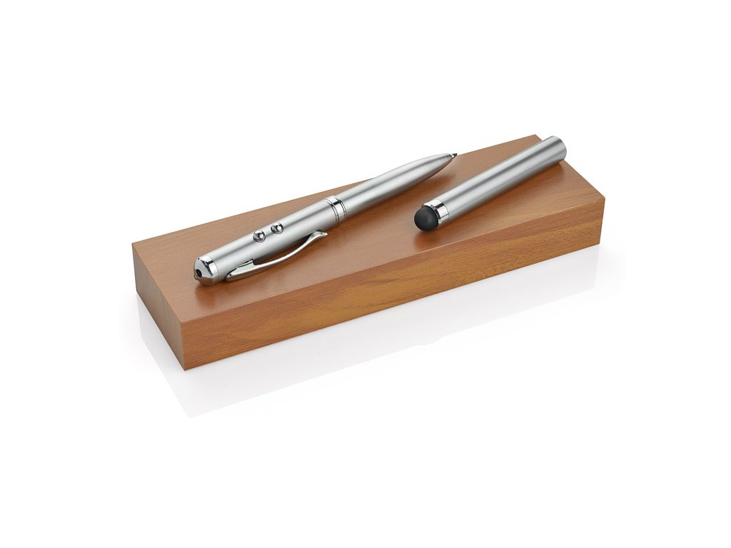 Laserové ukazovátko je dodáváno v dárkové dřevěné krabičce, na kterou lze gravírovat logo firmy nebo organizace.Součástí dodávky jsou 3 baterie typu LR41. Kuličkové pero má modrou náplň. Celé balení je v bílé papírové krabičce.