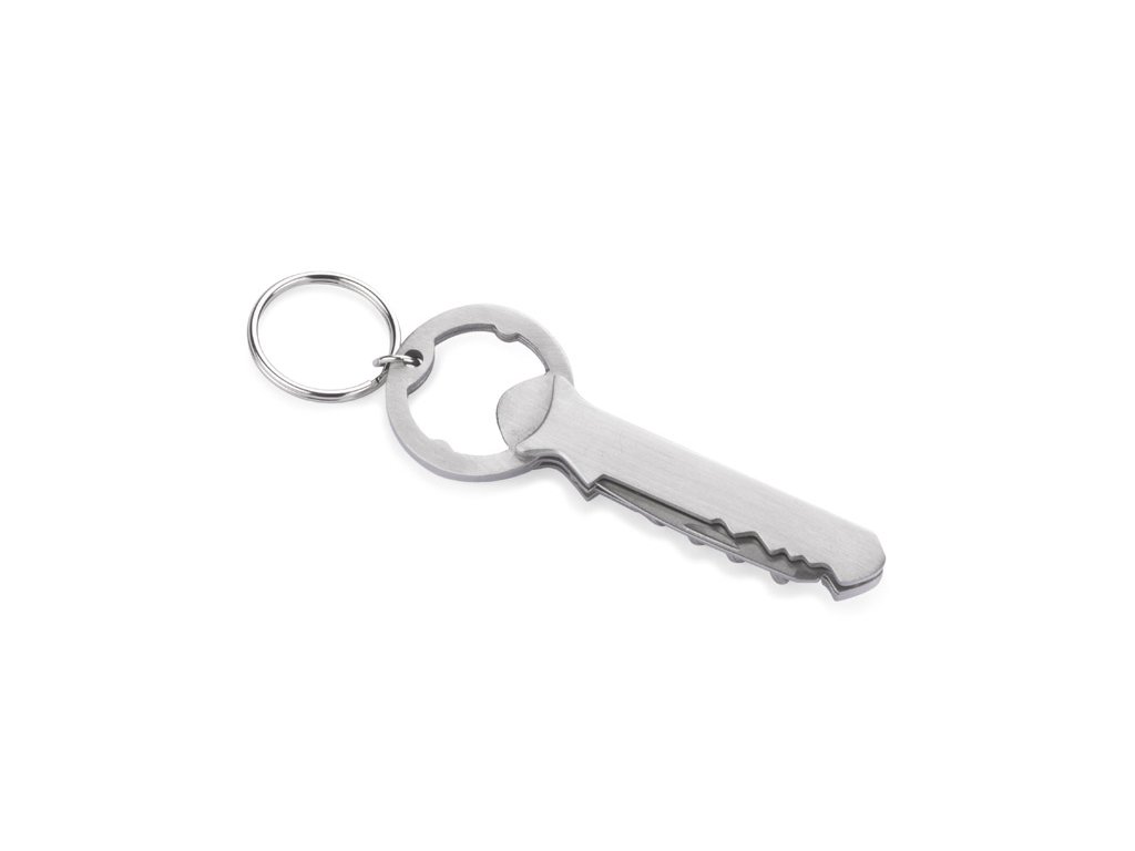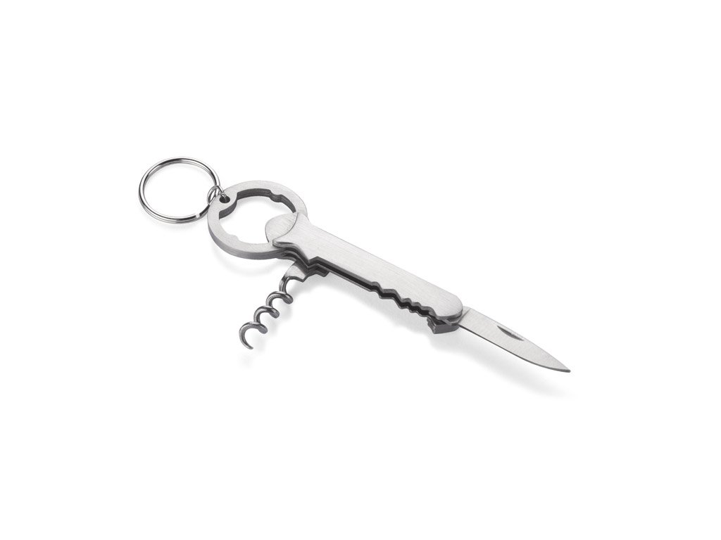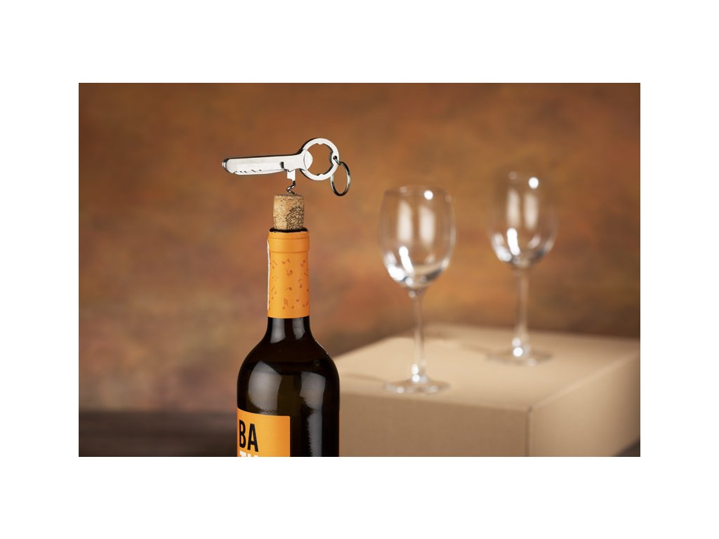 Klíčenka, otvírák na láhve a vývrtka na víno. Vyrobeno z nerezové oceli. Baleno v hnědé kartonové krabici.