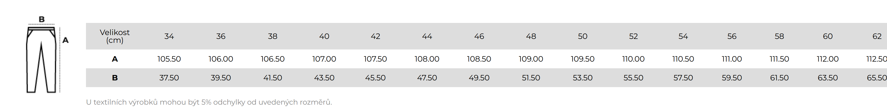 | Rozměr výrobku: | Velikost 34, 36, 38, 40, 42, 44, 46, 48, 50, 52, 54, 56, 58, 60, 62, 64 |