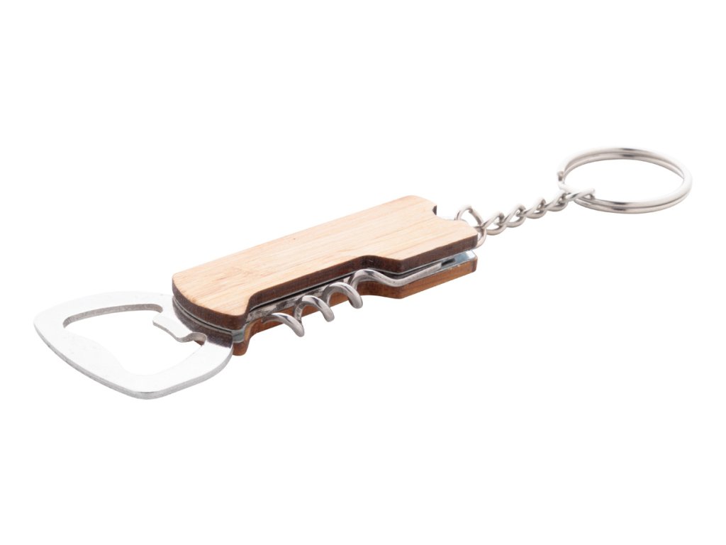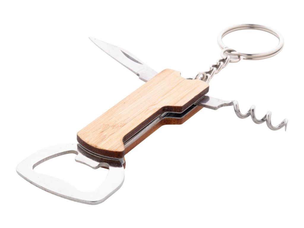 Kvalitní přívěšek na klíče s otvírákem na láhve z bambusu a nerezové oceli s vývrtkou a kapesním nožem.