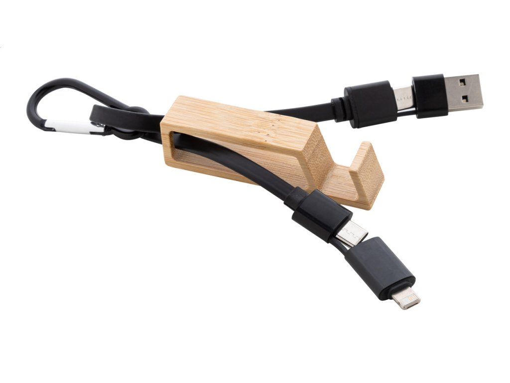 USB nabíjecí kabel s karabinou + bambusový stojánek na mobil